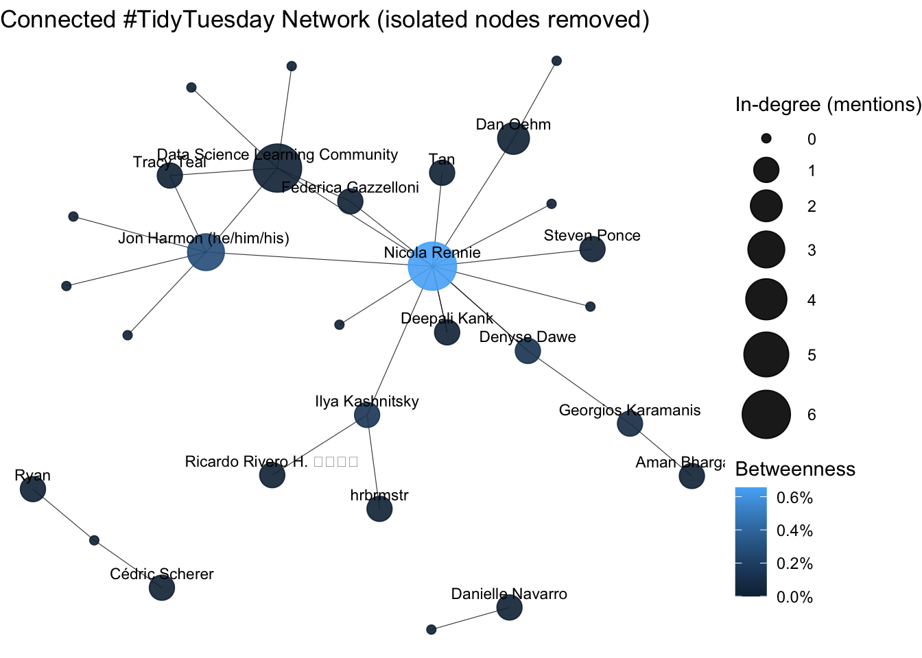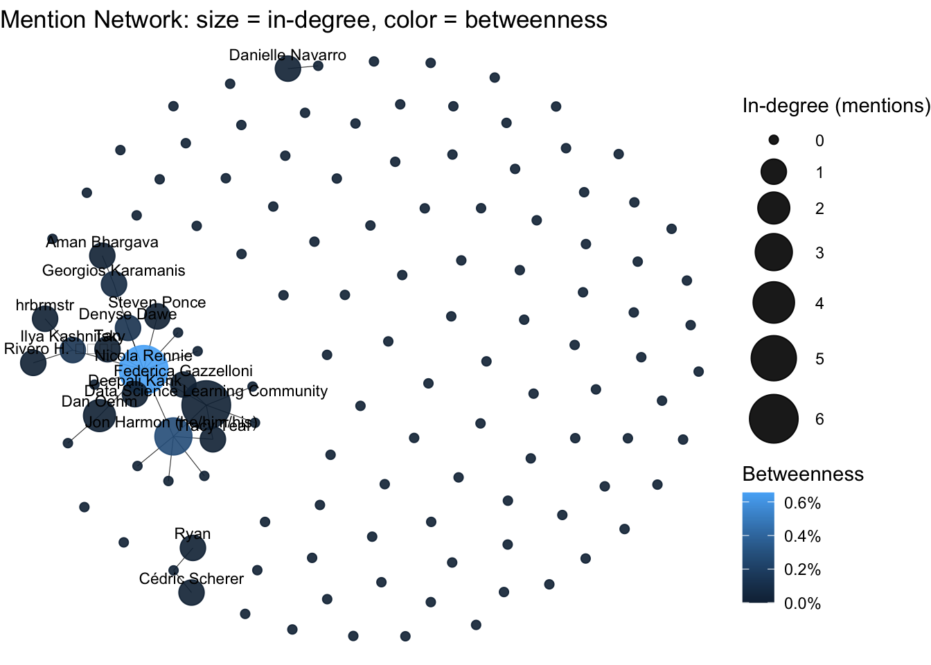This visualization shows the structure of the #TidyTuesday network on Bluesky. Larger nodes represent users who receive more mentions, and the color indicates their betweenness centrality—how crucial they are in connecting parts of the network.
